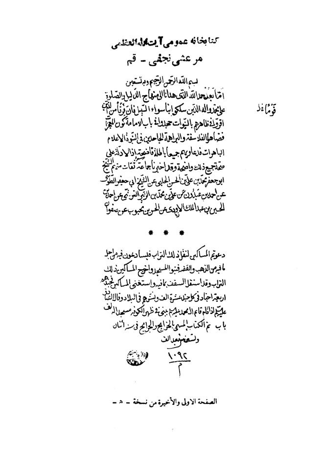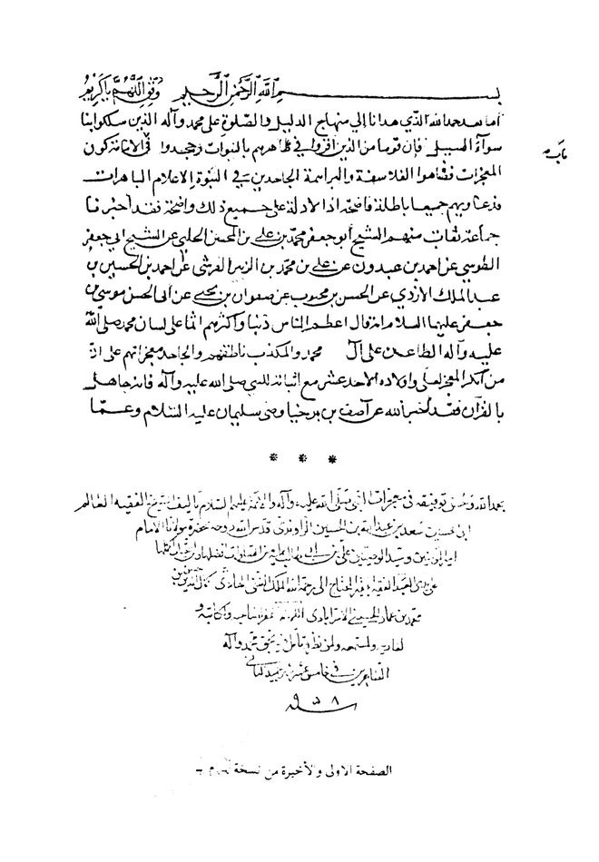 وأكمل صلواته على أمين وحيه ، وخاتم سفرائه، محمد رسول اللّه، وعلى آله المصطفين الذين أورثهم اللّه کتاب و حيه، وجعلهم مجاري أمره ، ومجالی آیاته ومعجزاته، فبعثوا الفقهاء امناء على حفظ أحاديث معجزات رسول الله والأئمة الاثني عشر من آله و روایتها